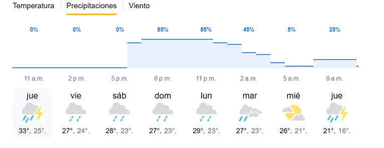 Hay un 85% de probabilidad de precipitaciones a partir de las siete de la tarde.
