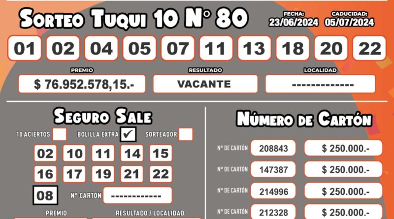 Este domingo 23 de junio se llevó a cabo el sorteo del Tuqui 10: el primer premio quedó vacante. Ningún tucumano o tucumana es el ganador de los $76.952.578 que estaban en juego, y el pozo millonario sigue creciendo.