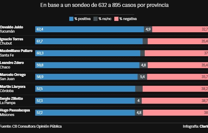 Se trata de la encuesta mensual que difunde CB Consultora Opinión Pública, en base a la imagen que tiene cada gobernador en su provincia publicada por Clarín. Para la edición de febrero, que Clarín adelanta este martes, la firma que dirige el analista Cristian Buttié entrevistó entre 632 y 895 vecinos por distrito. Los resultados se presentaron con un margen de error de 3% a 4%.