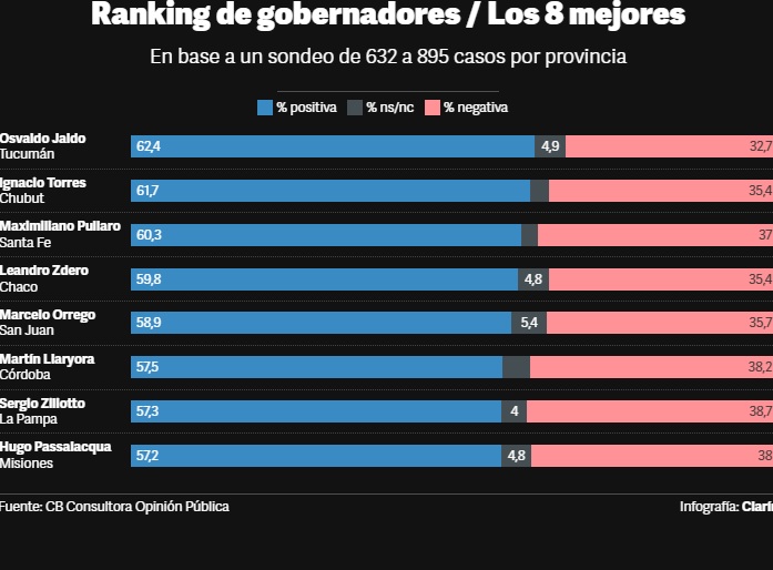 Además del liderazgo de Jaldo, se destaca otro dato pero por la inversa. Hay seis gobernadores (sobre 24) que terminaron con balance negativo de imagen: esto es, más rechazos que apoyos.