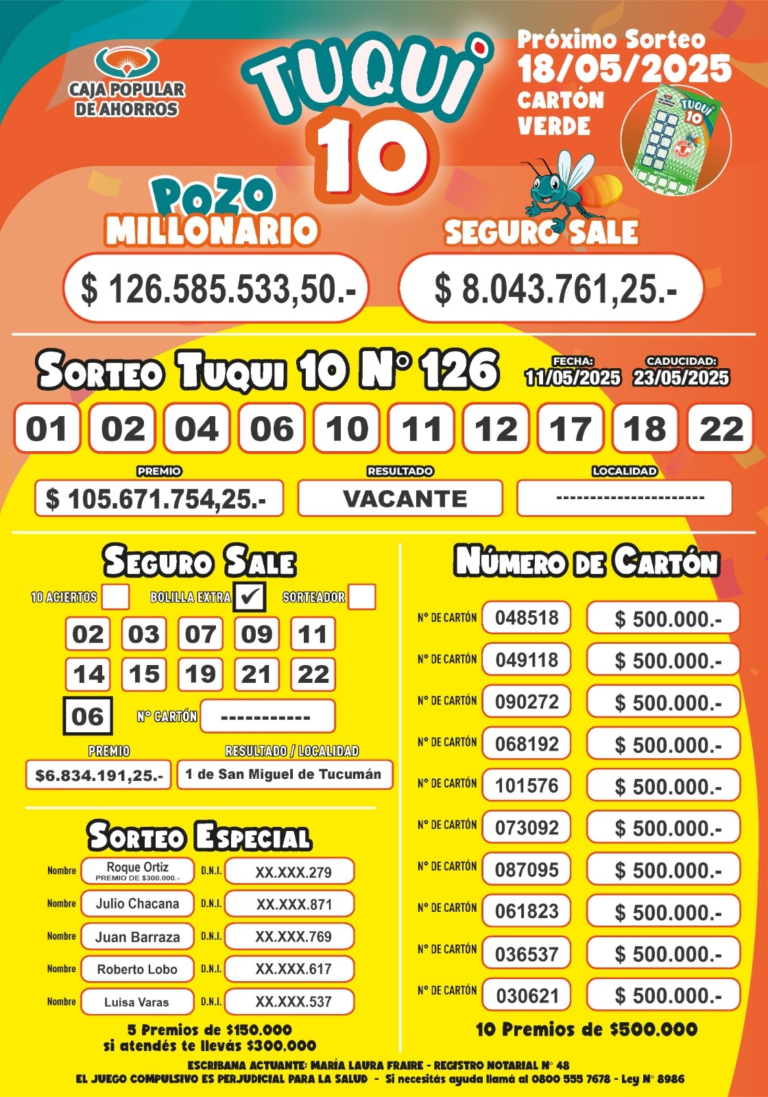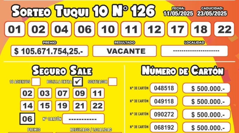 Este domingo 11 de mayo se realizó el sorteo 126° del Tuqui 10 y el primer premio quedó vacante. Ningún tucumano o tucumana fue el ganador de los $ 105 millones que estaban en juego, y el pozo millonario sigue creciendo.