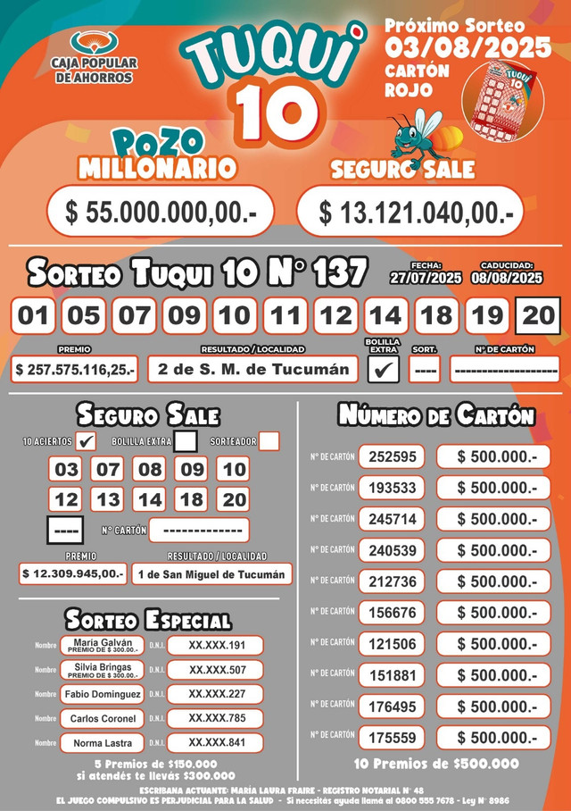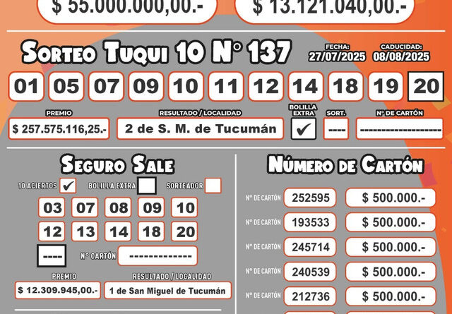Este domingo 27 de julio se realizó el sorteo 137° del Tuqui 10 y dos apostadores se llevaron el pozo millonario de $ 257,5 millones. Se supo que los afortunados ganadores son de San Miguel de Tucumán.